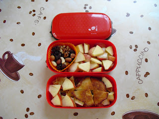 Unten haben sich wieder Apfelstückchen und Apfelpfannkuchen eingefunden. Nach oben hat es der Rest vom Apfel zusammen mit Tellerpfirsichstückchen geschafft. Außerdem gab's noch etwas Studentenfutter in meiner Herzsilikonform.