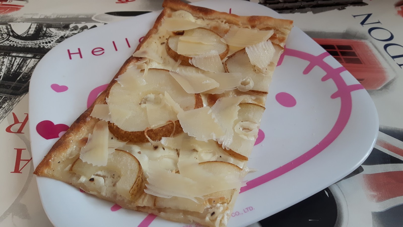 Flammkuchen mit Birnen, Zwiebeln und Parmesan