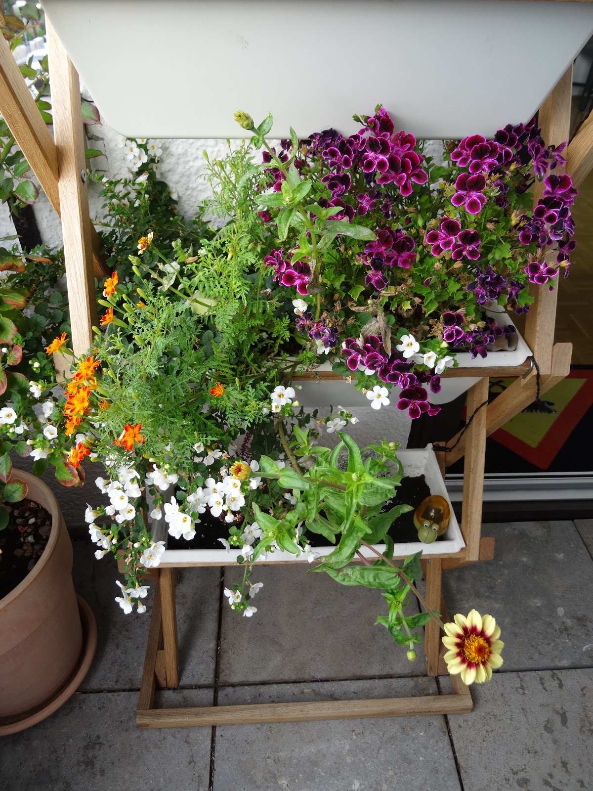 Da der September so schön war, haben auch die Pflanzen auf meinem Balkon noch mal alles gegeben. Hier gibt es jetzt daher auch einen ganzen Schwung von Bildern, da die Mischung aus neu und alt wirklich hübsch aussieht ^^ Aufgrund des Wachstumsschubs konnte ich die zweite Ebene von unten in meinem vertikalen Garten auch einfach noch nicht neu bepflanzen, es blüht doch alles noch so schön.Ich greife für den Winter immer auf Altbewährtes zurück, weswegen es eigentlich immer Erika in verschiedenen Farben und auch Silberdraht gibt. Bei allen anderen Pflanzen weiß ich natürlich wieder nicht, wie sie heißen ;) Meinen Salbei habe ich auch einfach mal sitzen lassen, vielleicht übersteht er ja den Winter.Ganz unten sitzt auch eine Erika und ein Silberdraht. Man sieht es aber im Moment so gar nicht, weil obendrüber alles so in alle Richtungen hat wachsen lassen. Hoffentlich bleibt es jetzt noch lange so. Wenn die Pflanzen dann doch mal verblühen sollten, kommen in diese Ebene wieder Blumenzwiebeln für Krokusse. Da ich letztes Jahr aufgrund der milden Temperaturen ja schon die ersten grünen Spitzen im Oktober und November hatte, werde ich die Zwiebeln in diesem Jahr so spät wie möglich setzen.Auf meiner Pflanzleiter sind die Tomaten rausgeflogen und haben Platz für die Winterbepflanzung gemacht. Die drei großen Tomatenpflanzen bringen immer noch rote Früchte hervor, sodass sie immer noch stehen bleiben dürfen. Im großen Terrakottatopf sitzt auch eine Erika und so etwas Hängendes...Gleichzeitig habe ich alle Lavendel-, Bohnenkraut-, Katzenminze- und Thymianpflanzungen -auch auf der Pflanzleiter- sitzen lassen. Mal sehen, ob es davon irgendetwas durch den Winter schafft. Im Terrakottatopf habe ich die Kräuter dafür radikal rasiert und dann Erika und Co. an die andere Seite gesetzt.